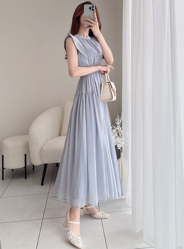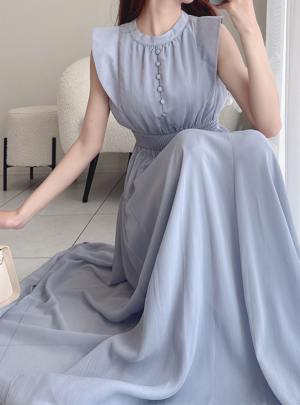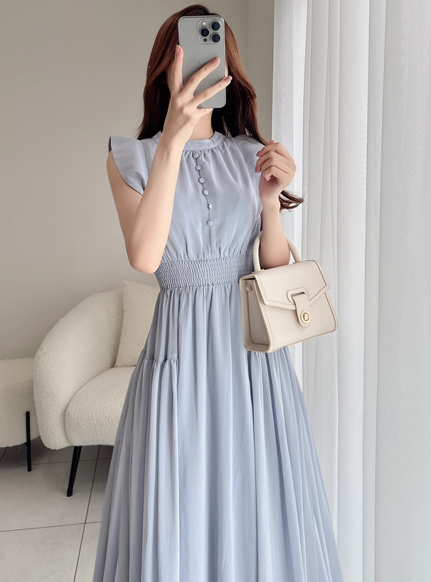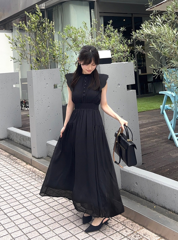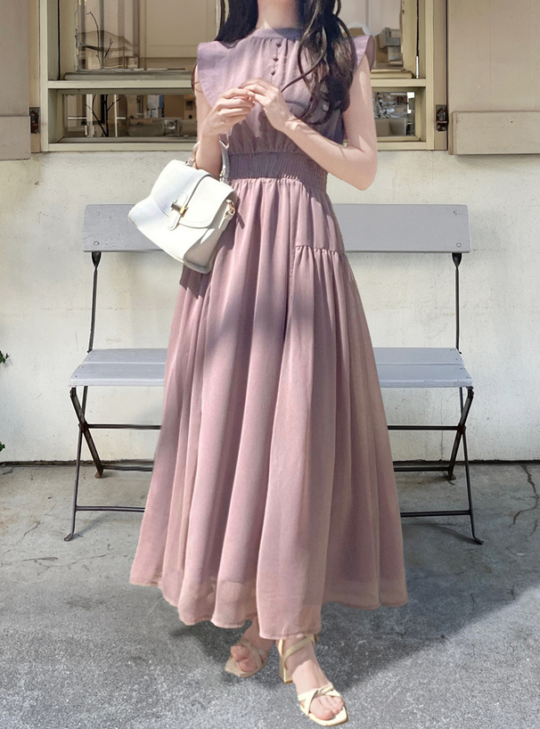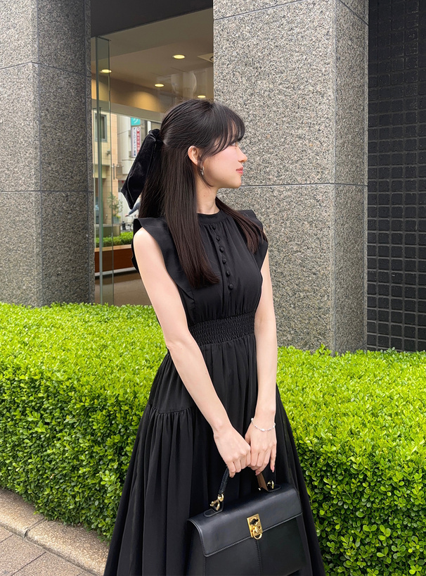 肩部帶有小飛袖修飾手臂線條,讓整體更顯柔美