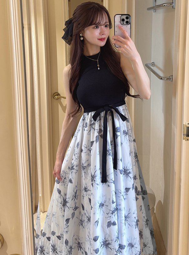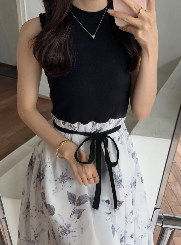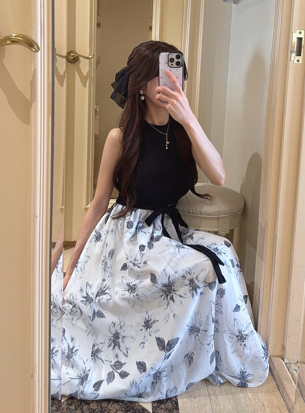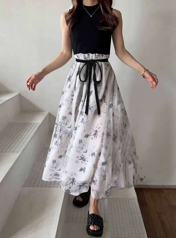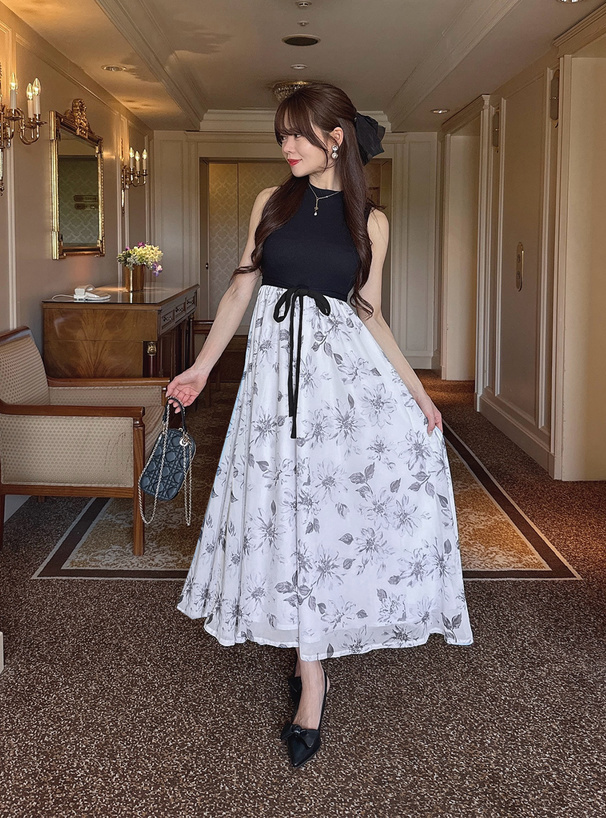 下身則是黑白花卉圖騰的雪紡裙擺,隨步伐飄逸輕柔