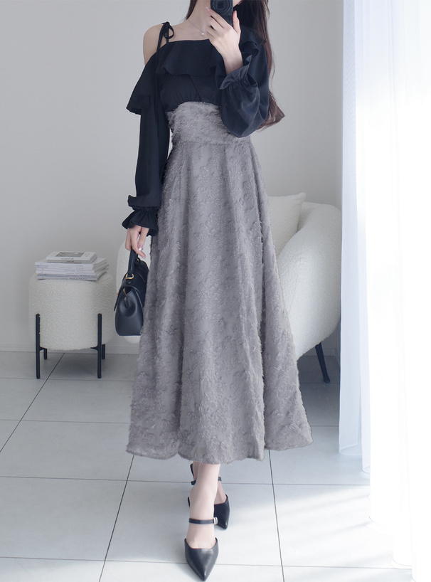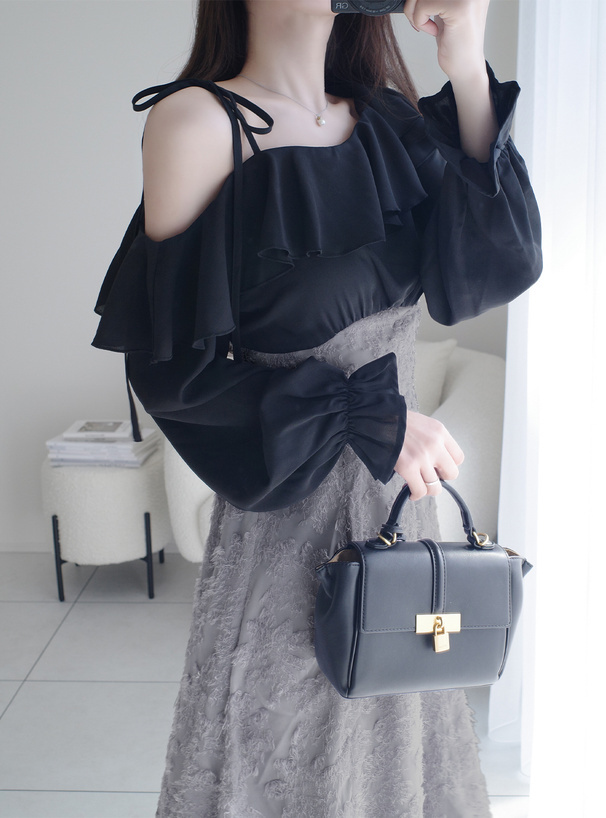 荷葉邊延伸至肩線,微露肌膚更顯優雅