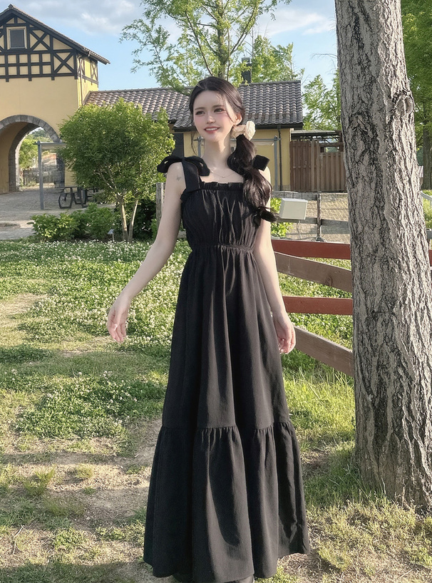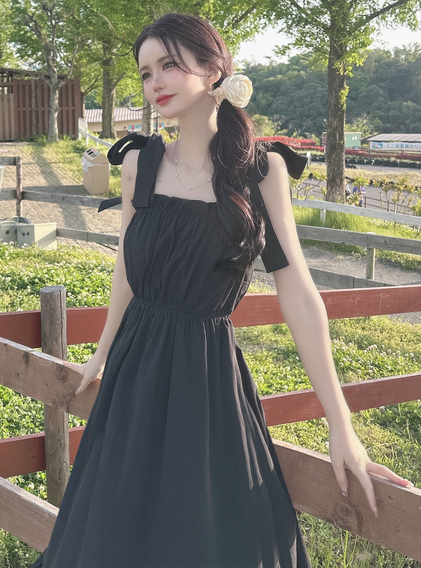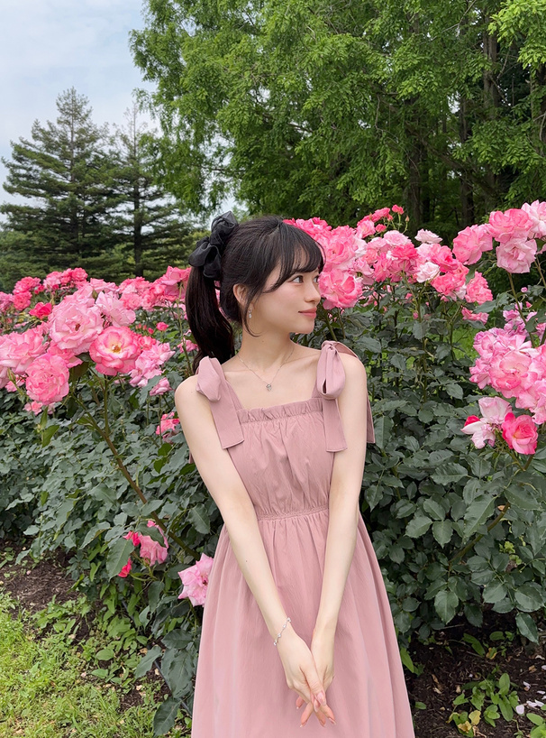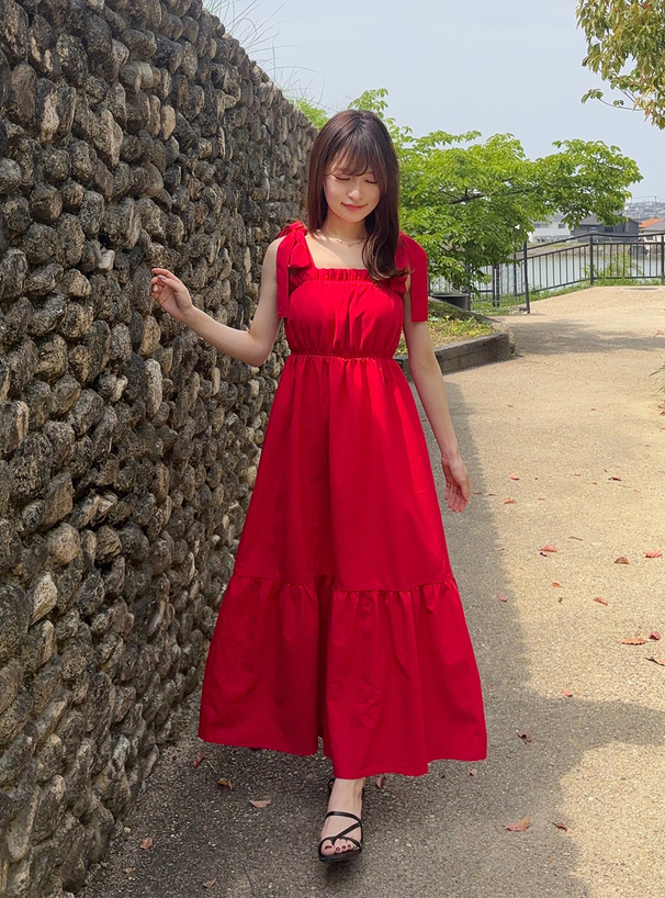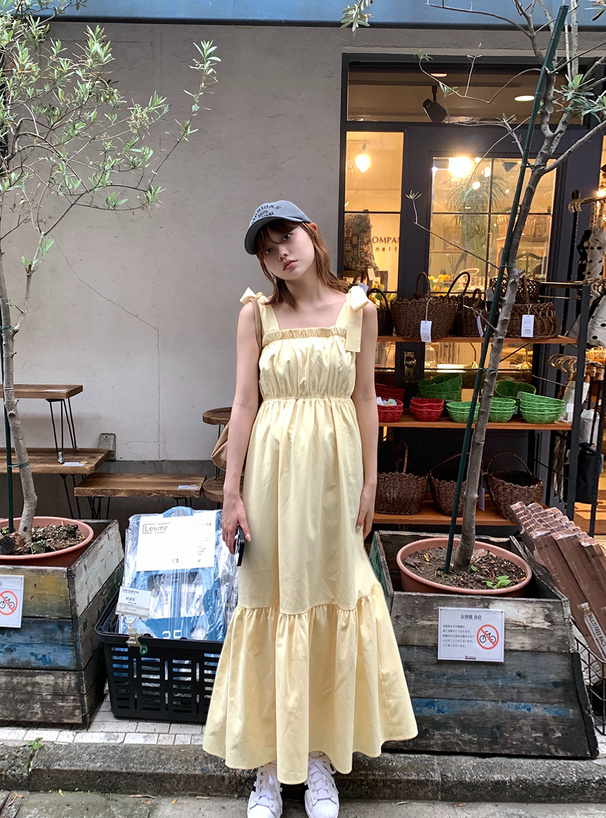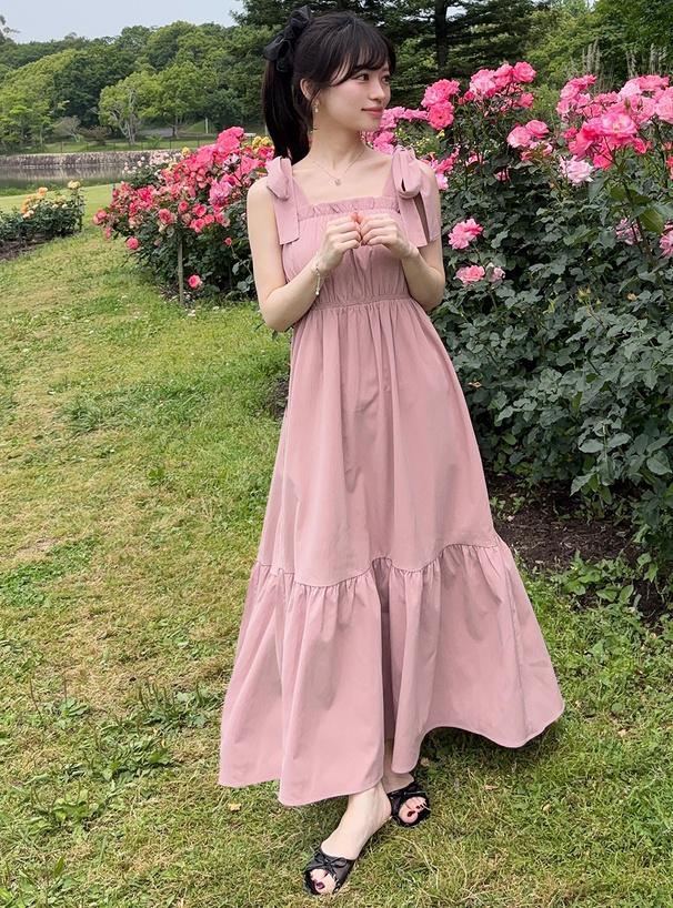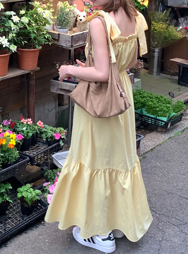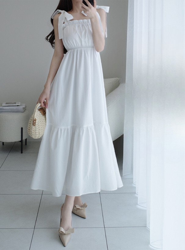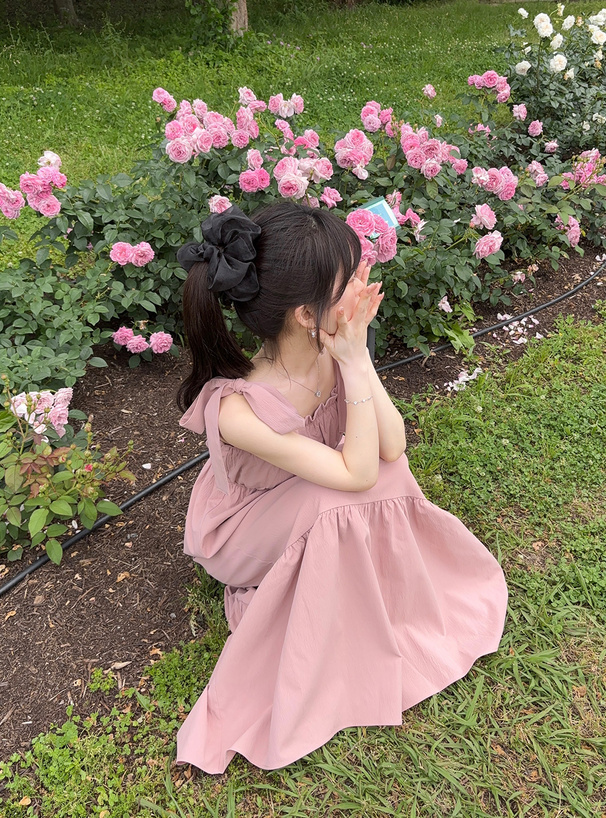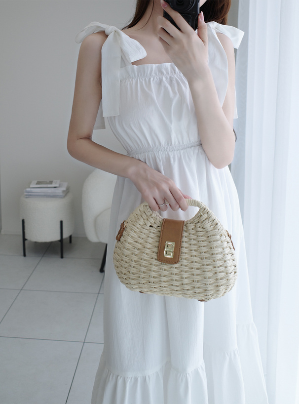 綁帶蝴蝶結肩帶+高腰剪裁搭配微壓紋面料