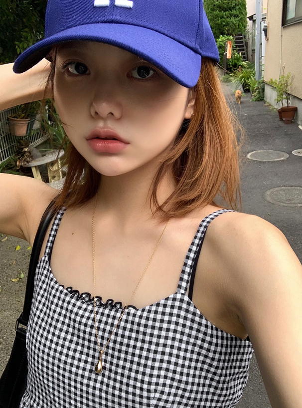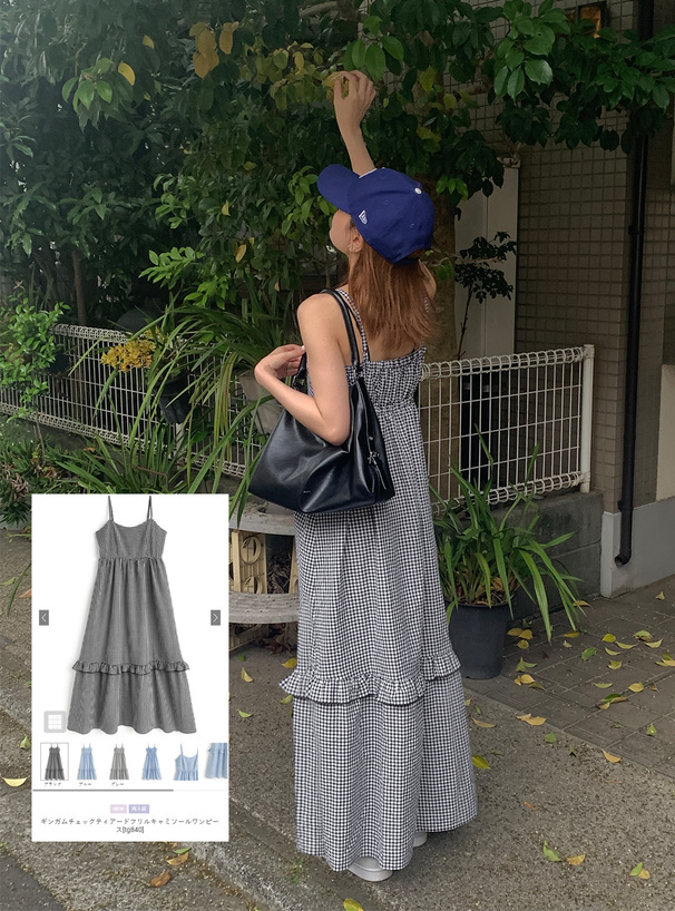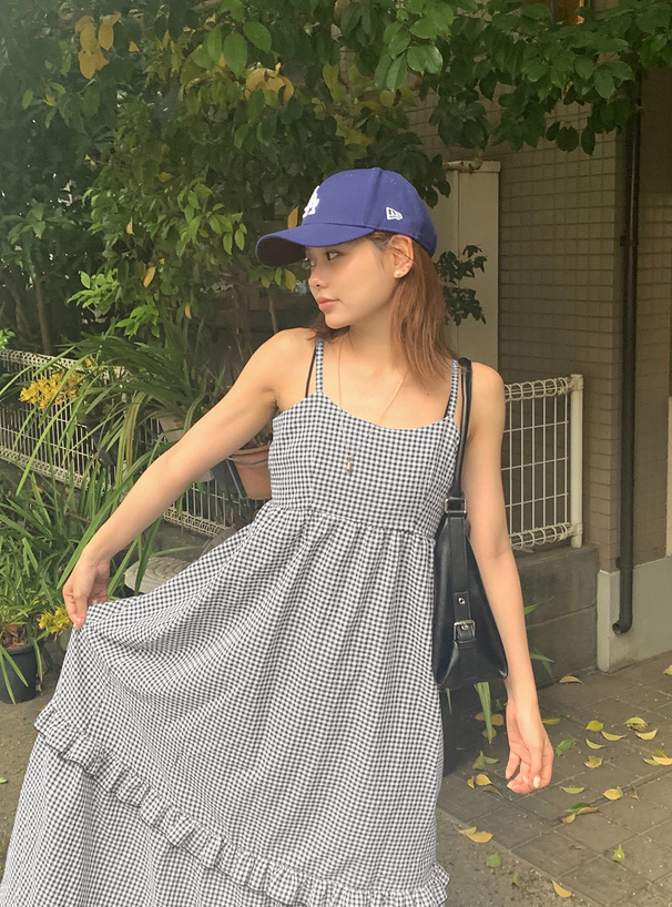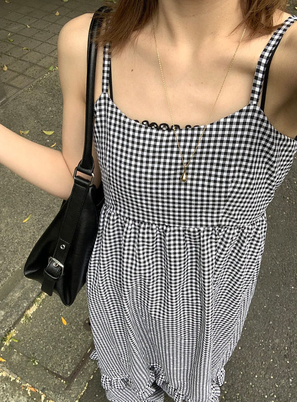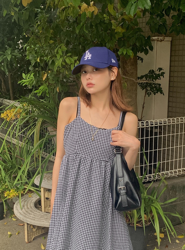 這款細肩帶洋裝以清新細緻的格紋為主角