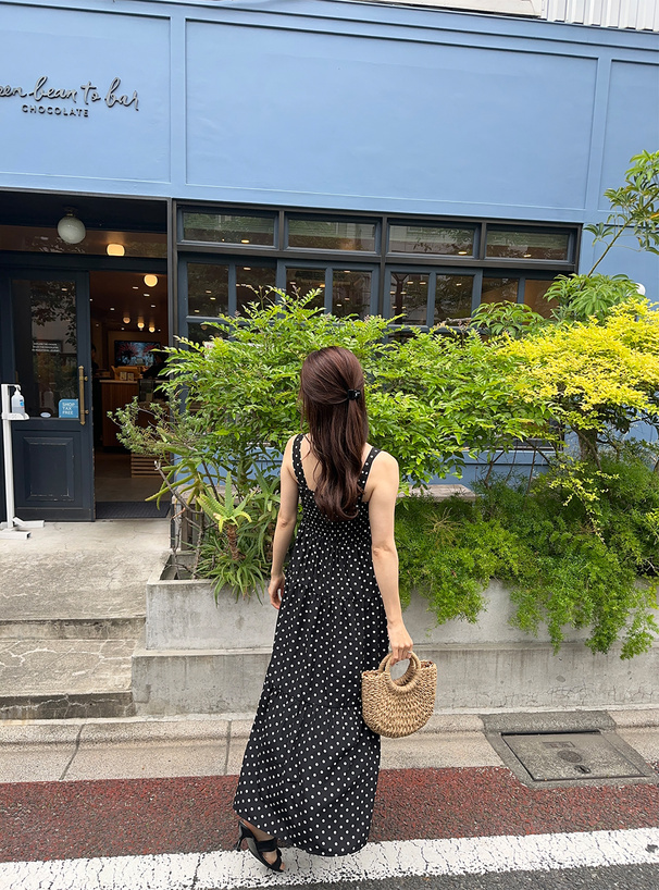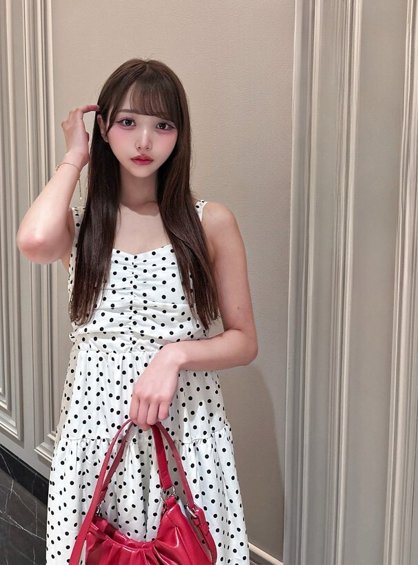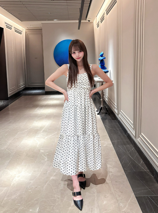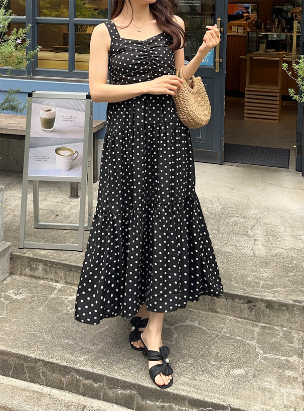 這款洋裝以復古波點搭配抓皺設計