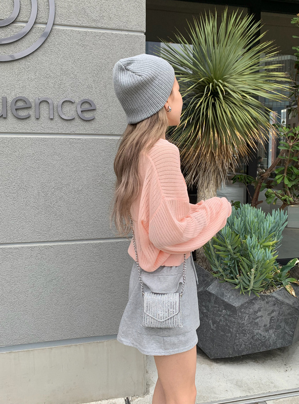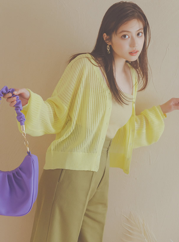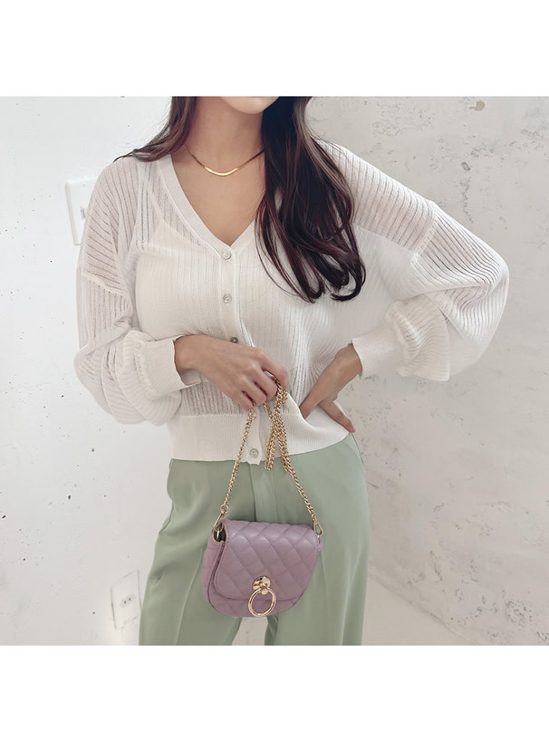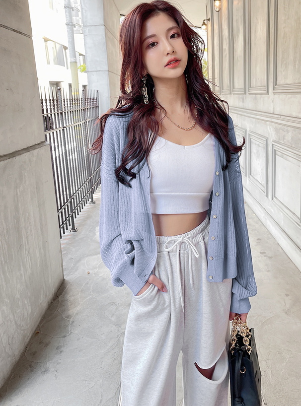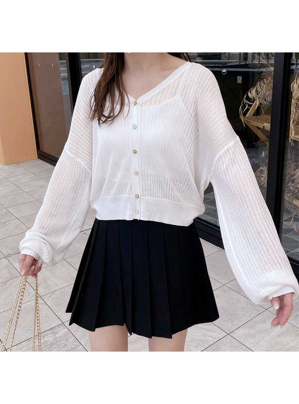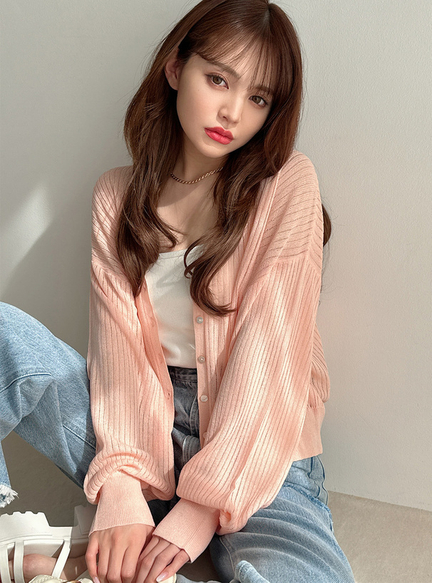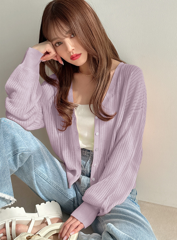 這款針織開襟罩衫採用帶微透膚感的細羅紋材質