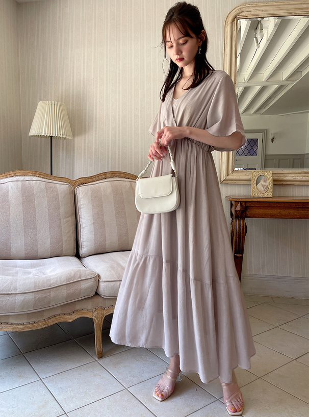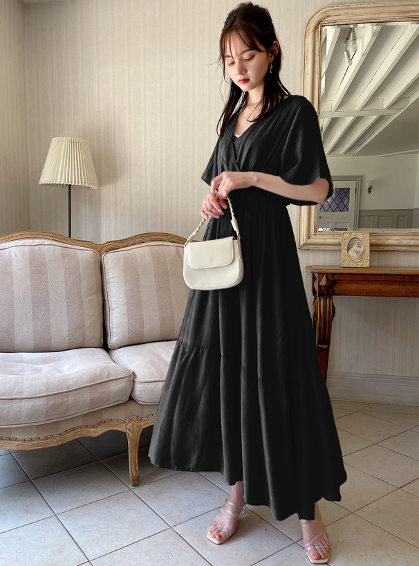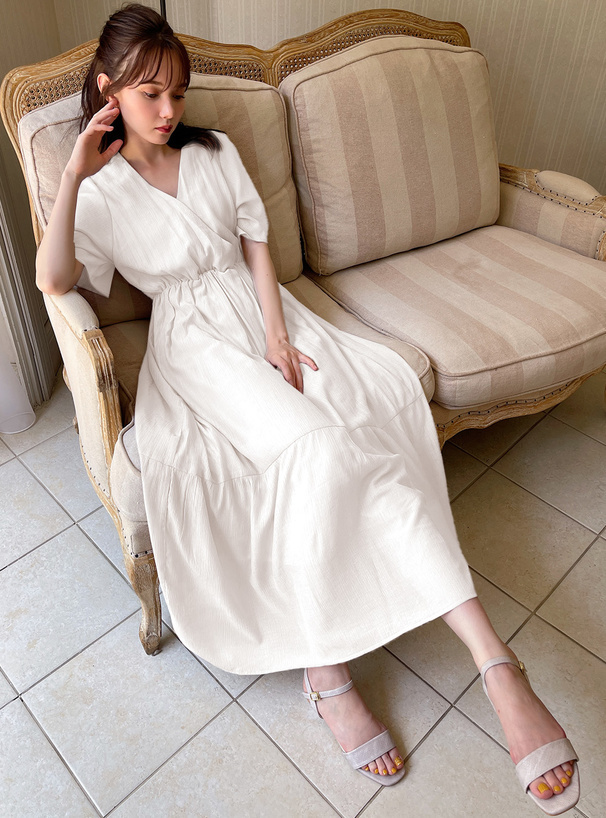 這款洋裝以交叉V領設計營造出溫柔知性的氣質