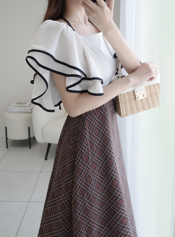 上身是波浪感滿滿的荷葉袖與配色滾邊