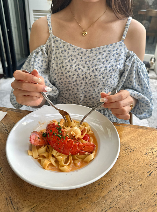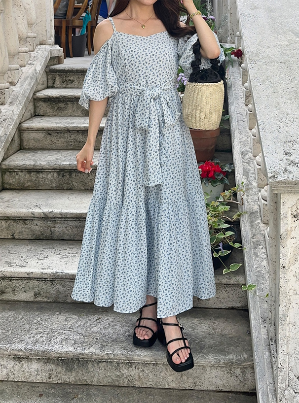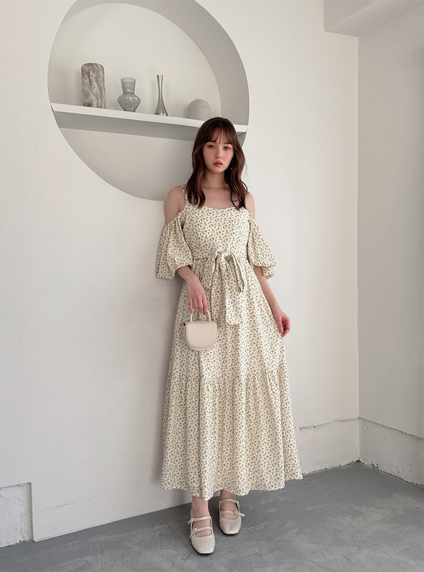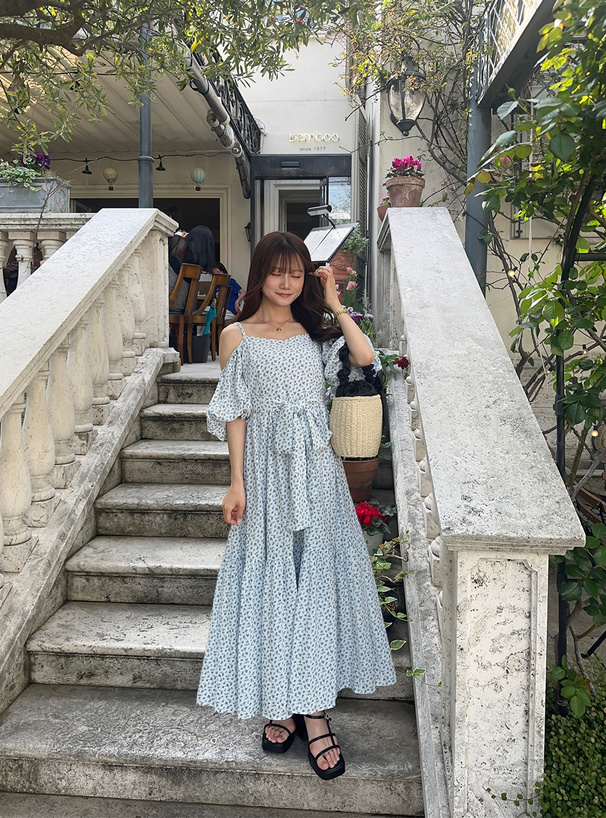澎澎袖結合露肩與細肩帶設計,完美展現肩頸線條