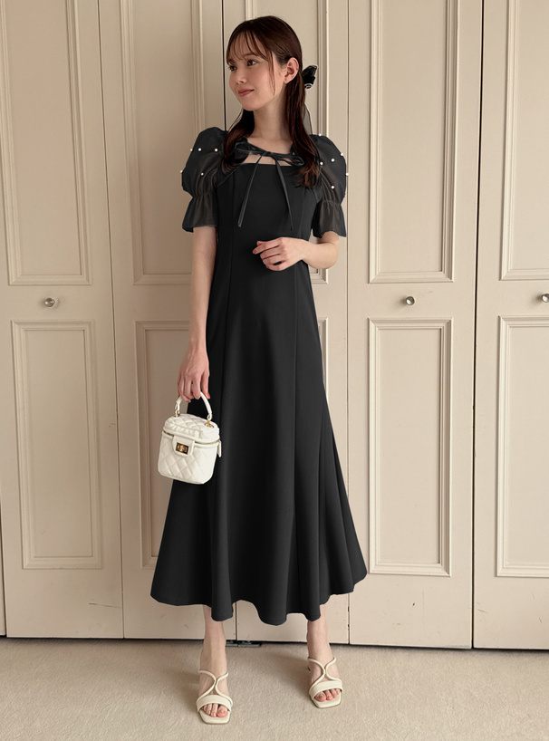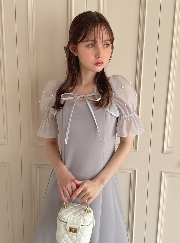搭配一件帶有澎袖與珍珠點綴的薄紗小罩衫
