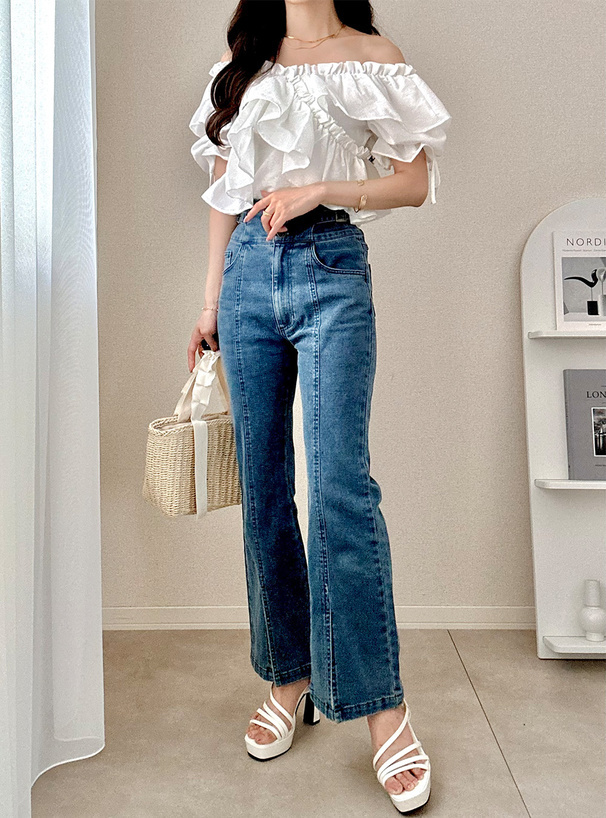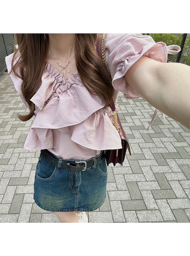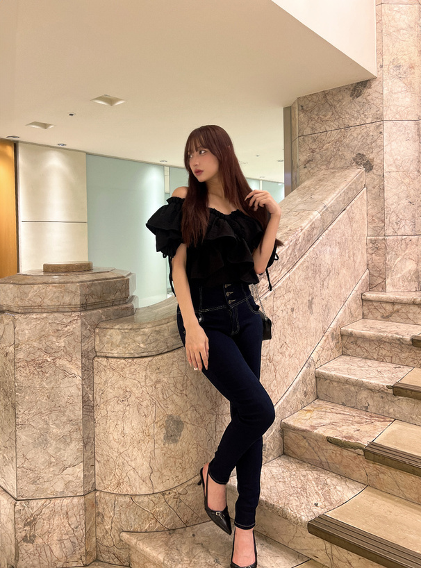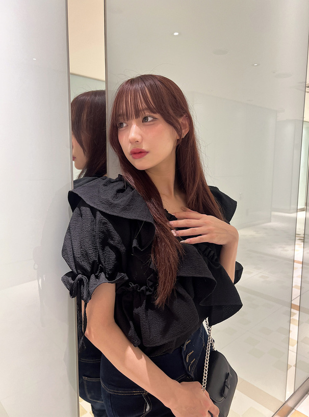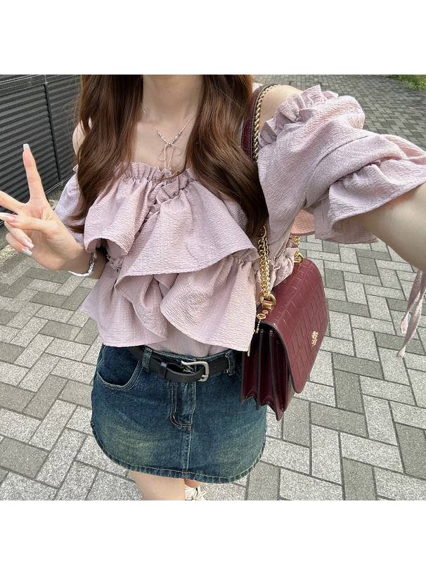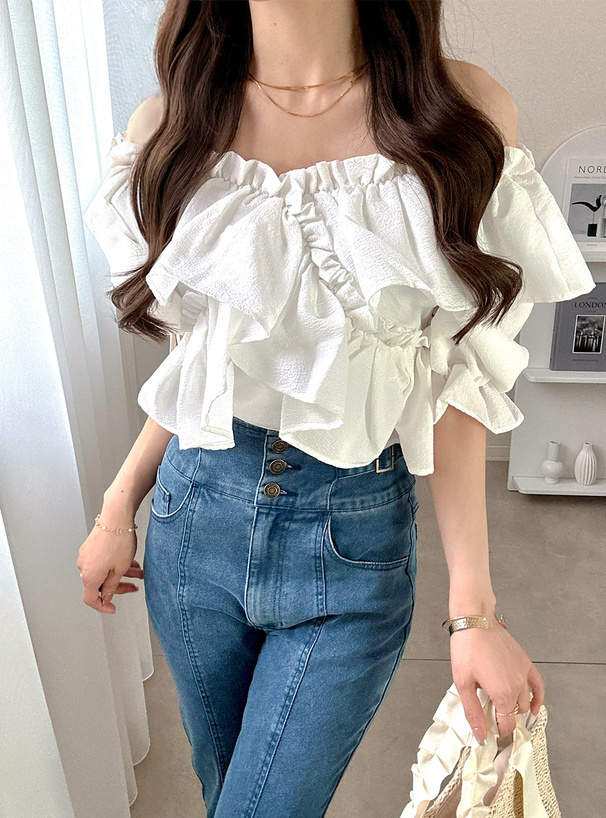 層層荷葉抓皺+一字領剪裁