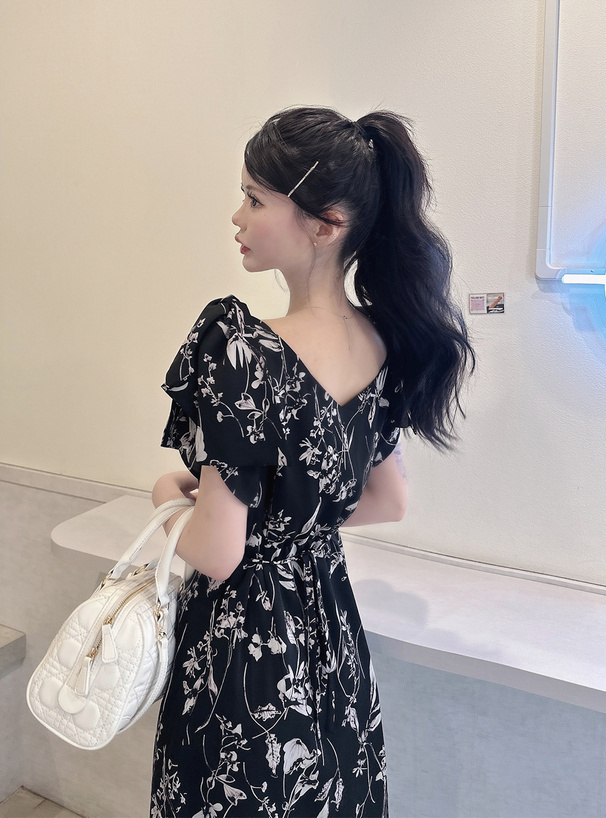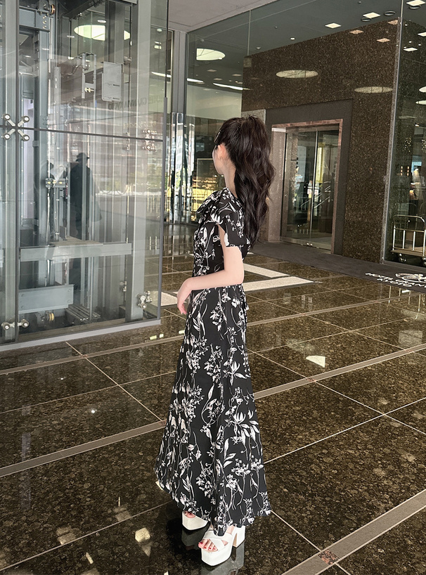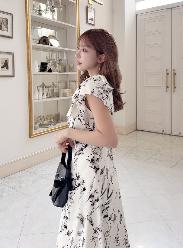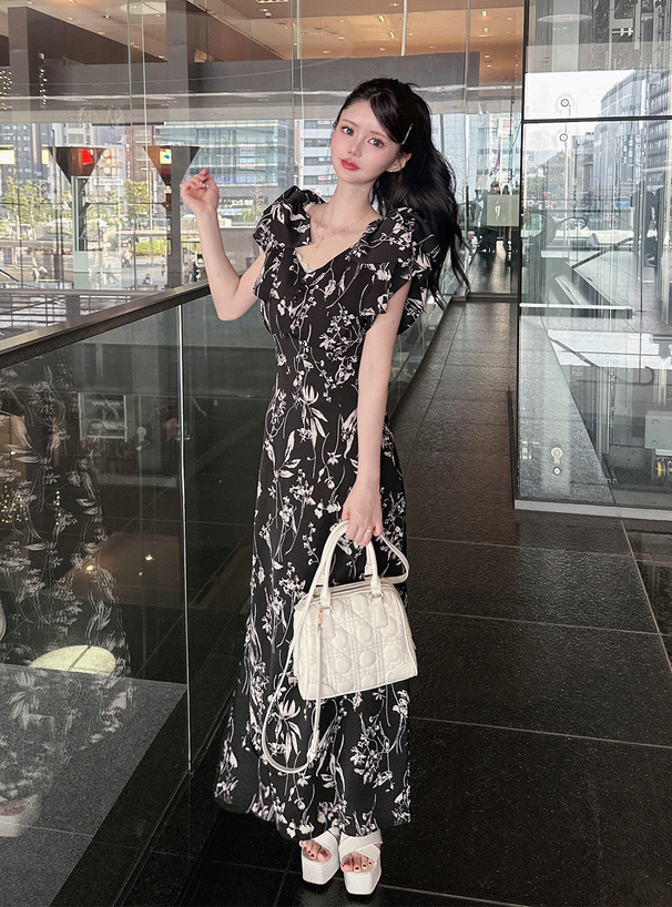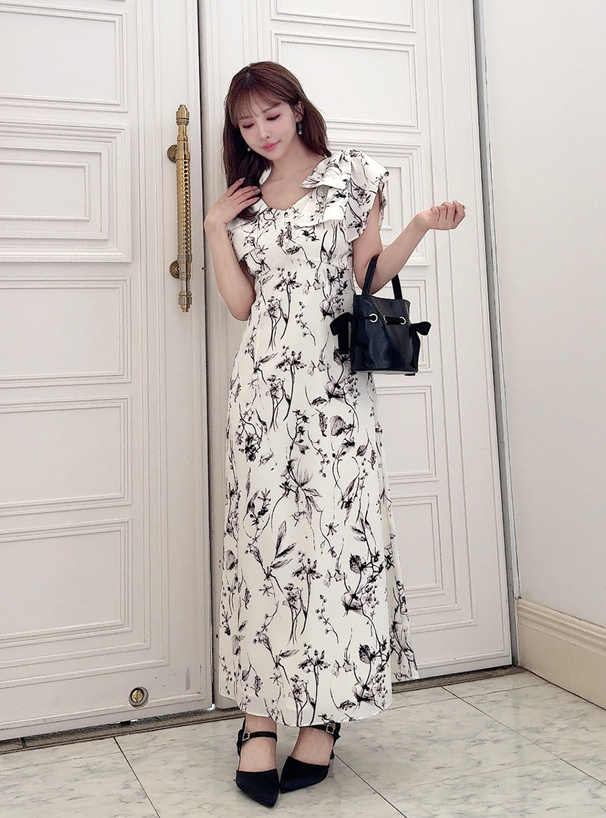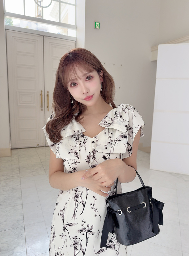 細緻的花草插畫印花搭配大蝴蝶結肩帶
