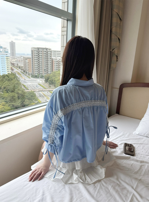 背面與袖口運用蕾絲與綁帶抽皺設計