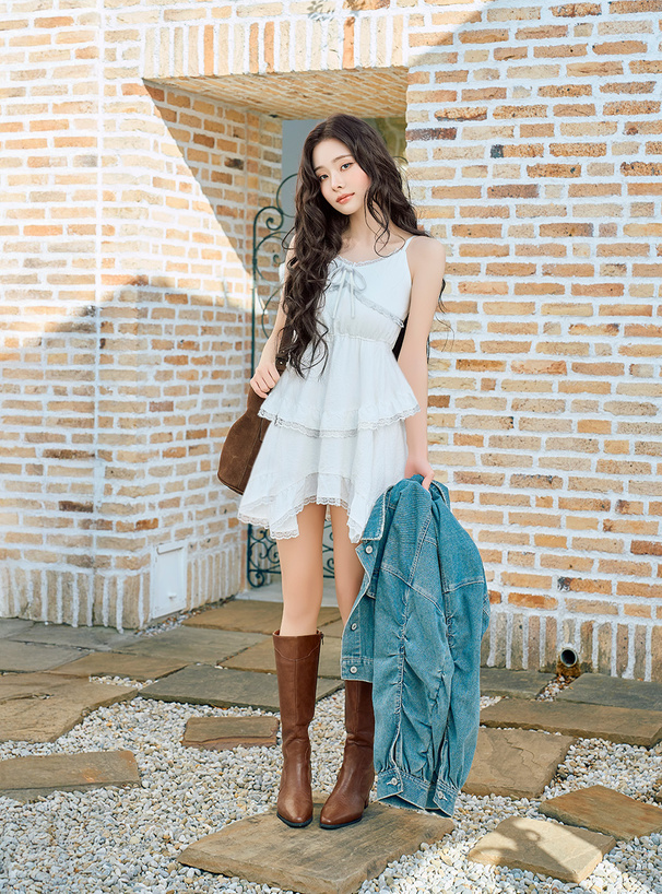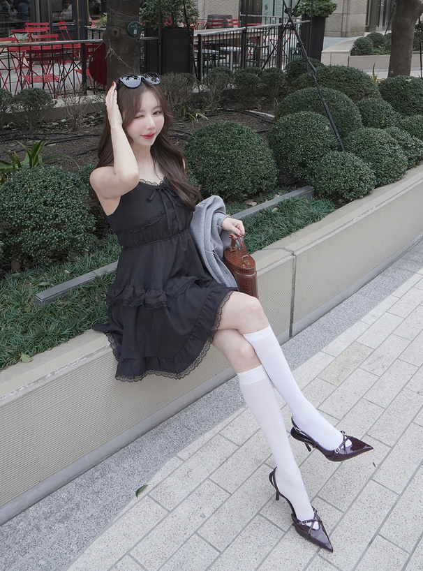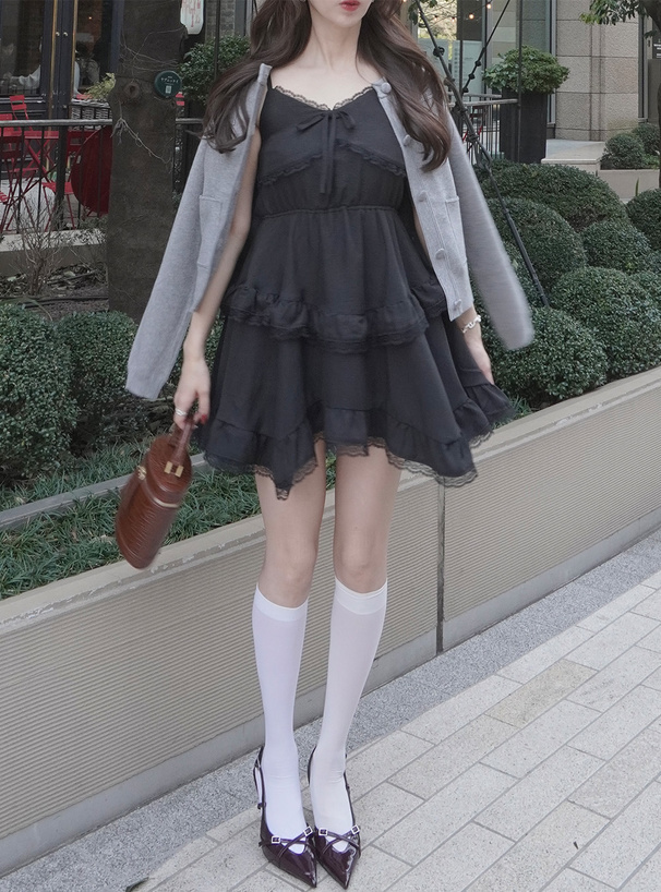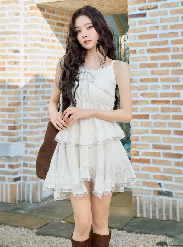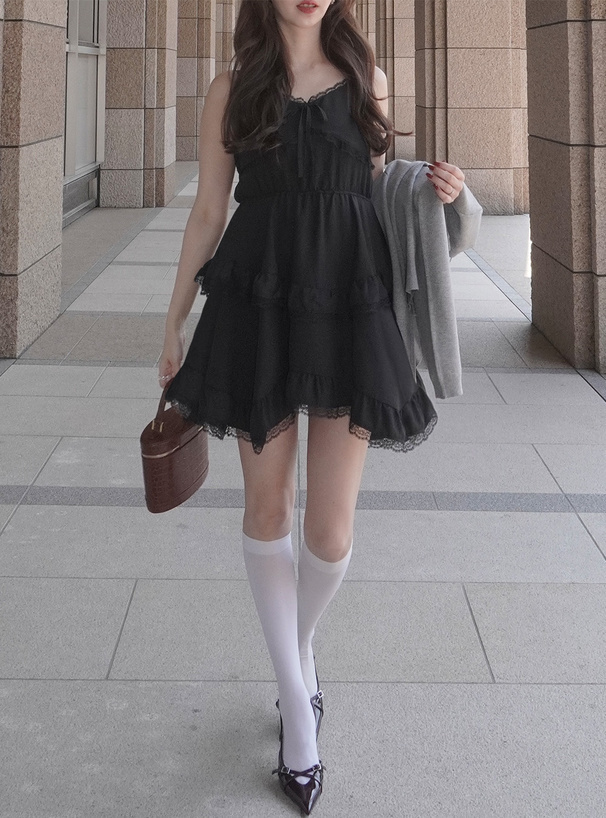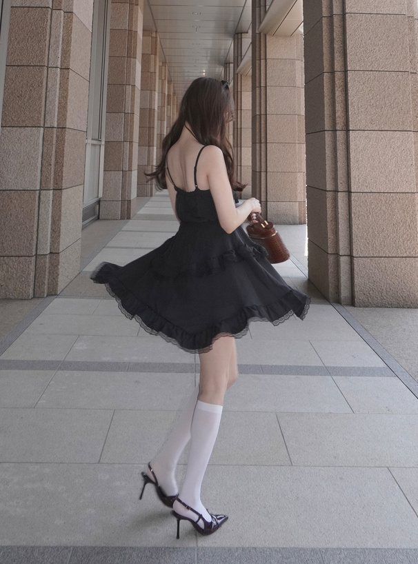 輕盈又甜美感滿分的蕾絲荷葉層次吊帶洋裝♡