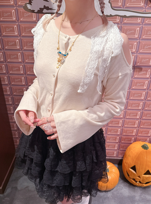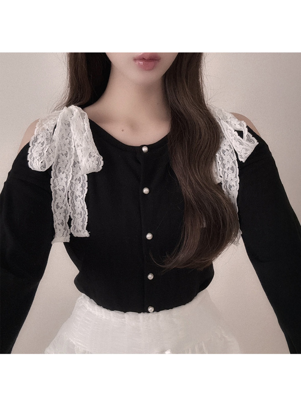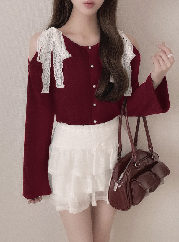 肩開設計搭配蕾絲蝴蝶結展現甜美氛圍