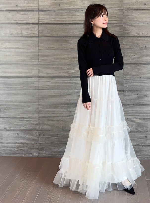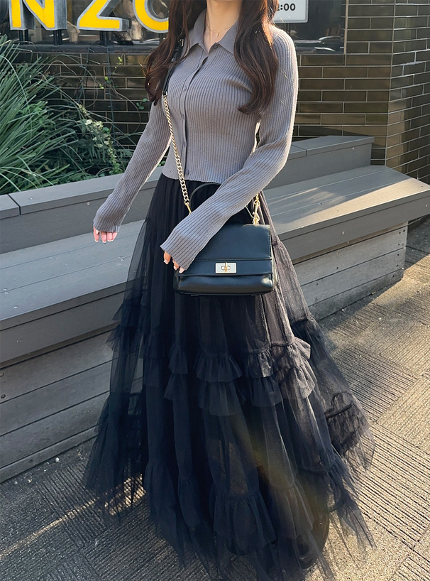 下身為蓬鬆層疊的薄紗長裙