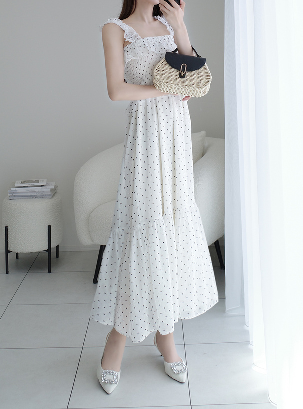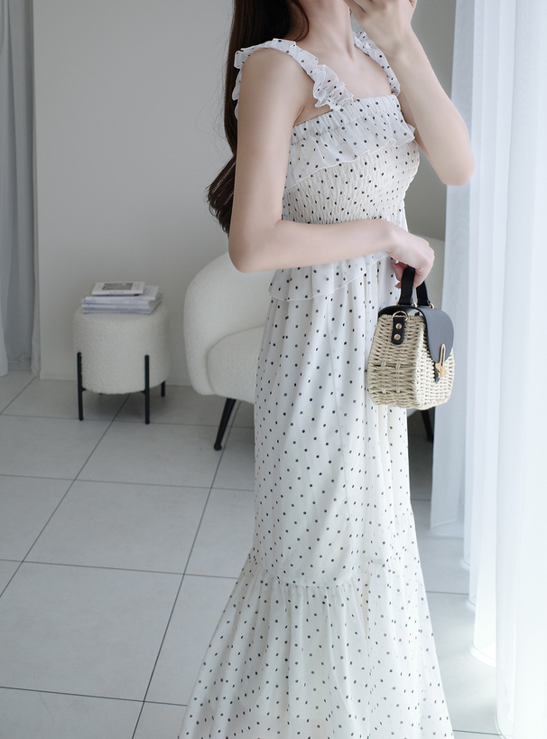 肩帶、胸前與腰間的荷葉邊設計增添甜美層次